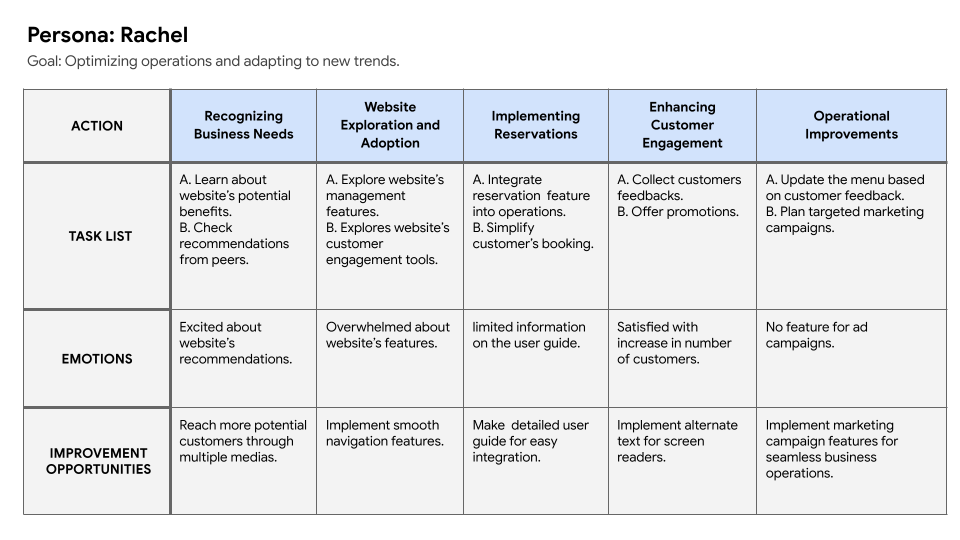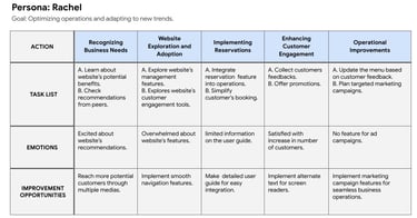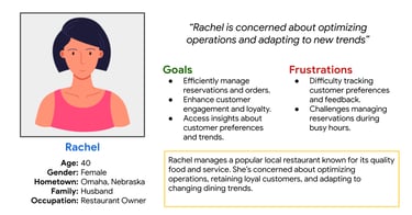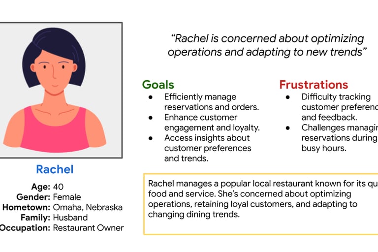 Rachel, a 40-year-old restaurant owner, represents the business perspective. Striving for operational efficiency and customer loyalty, she seeks tools to streamline reservation and order management, customer engagement, and data analysis. The app can address her challenges of managing reservations during busy periods and limited technology resources, enabling her to make informed decisions and enhance the overall dining experience at her establishment.