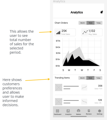 Each screen of the app was iteratively drafted on paper, ensuring that the elements that made it to the digital wireframe would adequately address user pain points. For the dashboard, I provided a high-level view of the restaurant's daily operations.